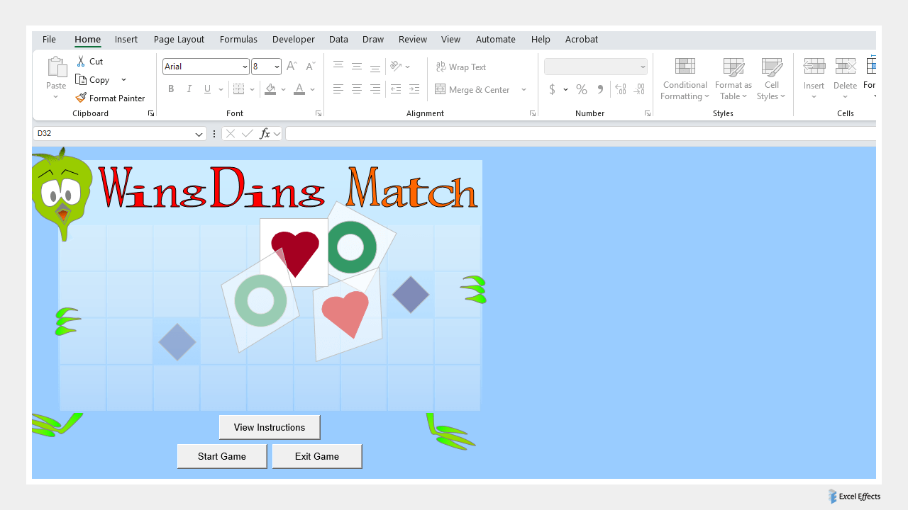 Before our other matching games, there was the original Wingding Match game. Unlike the others, there are no tricks to it. Just a straight matching game. Keep in mind, we developed this game in late 2007, in Excel 2003. Unlike the second version, it is not open-source.